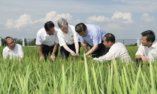 Chinese President Xi Jinping (3rd R), who is also general secretary of the Communist Party of China (CPC) Central Committee, inspects a rice breeding base in E'zhou City, central China's Hubei Province, July 22, 2013. Xi made an inspection tour in Hubei from July 21 to July 23. Photo: Xinhua