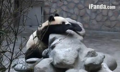 A panda attempts to climb on artificial rocks at the Chengdu Research Base of Giant Panda Breeding as viewed on iPanda.com.