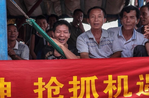Fishing men attend the port-opening ceremony of Wulian fishing port in Lingao county, South China's Hainan Province, Aug. 1, 2013. The Wulian port, the largest fishing port in Hainan, opened on Thursday, the same day on which the two-and-half-month summer fishing moratorium in the South China Sea ended. Photo: Xinhua