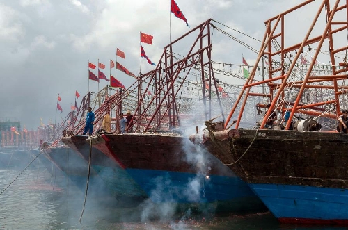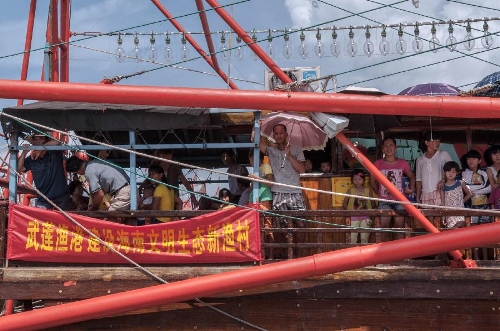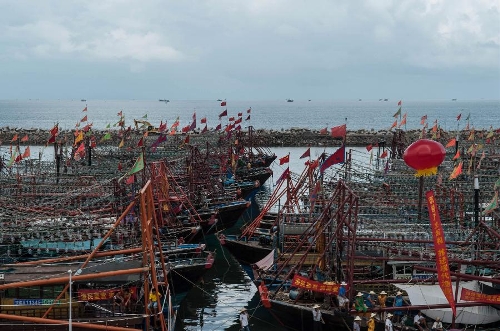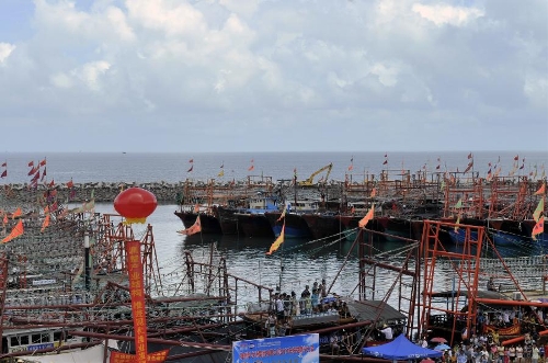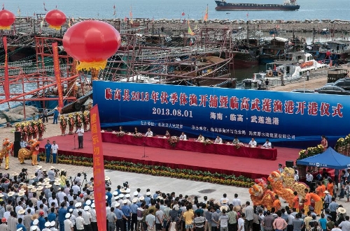 People attend the port-opening ceremony of Wulian fishing port in Lingao county, South China's Hainan Province, Aug. 1, 2013. The Wulian port, the largest fishing port in Hainan, opened on Thursday, the same day on which the two-and-half-month summer fishing moratorium in the South China Sea ended. Photo: Xinhua