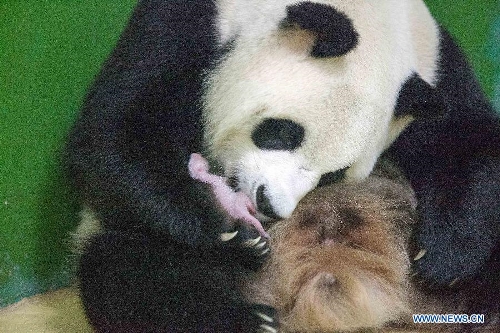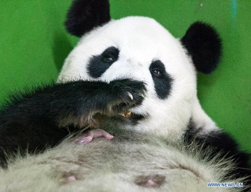 The giant panda nicknamed "Mei Qing" holds its cub at the Chime Long Safari Park in Guangzhou city, capital of south China's Guangdong Province, August 2, 2013. The giant panda cub, which was born on July 31, is the first born in Guangdong Province. (Xinhua/Liu Dawei)