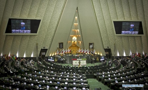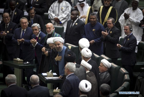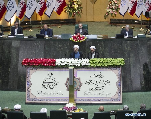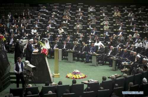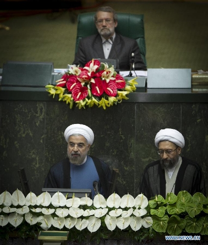 Iranian President-elect Hassan Rouhani (C) is sworn in as Iran's new president at Iran's Majlis (parliament) in Tehran, on Aug. 4, 2013. Hassan Rouhani was sworn in as Iran's new president on Sunday amid hopes that he will bring changes to the country's social and economic sectors as well as its foreign relations. (Xinhua/Ahmad Halabisaz)
