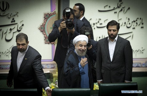 Hassan Rouhani (C) arrives at Iran's Majlis (parliament) before the swearing-in ceremony in Tehran, Iran, on Aug. 4, 2013. Hassan Rouhani was sworn in as Iran's new president on Sunday amid hopes that he will bring changes to the country's social and economic sectors as well as its foreign relations. (Xinhua/Ahmad Halabisaz)