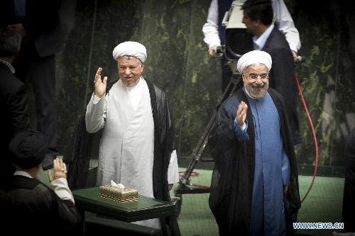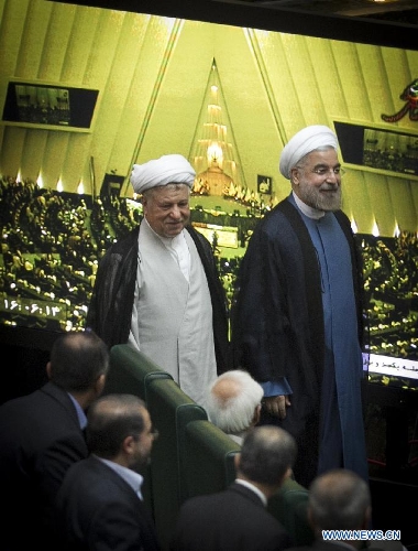 Hassan Rouhani (R) and former president Akbar Hashemi- Rafsanjani (L) arrive at Iran's Majlis (parliament) before the swearing-in ceremony in Tehran, Iran, on Aug. 4, 2013. Hassan Rouhani was sworn in as Iran' s new president on Sunday amid hopes that he will bring changes to the country's social and economic sectors as well as its foreign relations. (Xinhua/Ahmad Halabisaz)