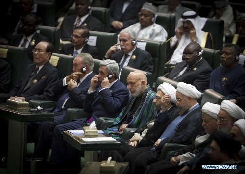 (From R to L) Kim Yong-nam, president of the Presidium of the Supreme People's Assembly of the Democratic People's Republic of Korea (DPRK), Lebanese President Michel Sleiman, Pakistani President Asif Ali Zardari and Tajikistan President Emomali Rahmon attend the swearing-in ceremony of Iranian President Hassan Rouhani in Tehran, Iran, on Aug. 4, 2013. Hassan Rouhani was sworn in as Iran's new president on Sunday amid hopes that he will bring changes to the country's social and economic sectors as well as its foreign relations. (Xinhua/Ahmad Halabisaz)