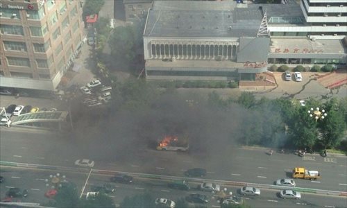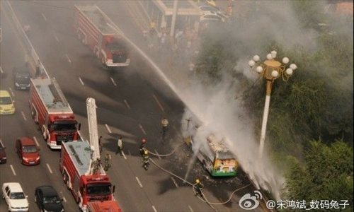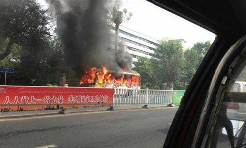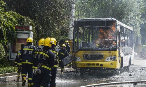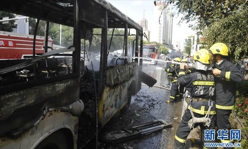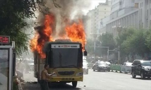 One person was killed and at least six other were injured after a bus caught fire Monday morning in Urumqi, Northwest China's Xinjiang Uyghur Autonomous Region.Photo: Xinhua