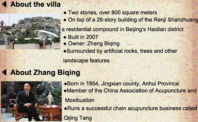 Zhang Biqing, property owner of an apartment on the top floor of a 26-story building in Park View, Haidian district, has been thrust into the public sphere on suspicion of illegally building his own villa on the rooftop of the complex. The alleged villa, which takes up 800 square meters and is covered by decorative rocks and plants, triggered a penthouse-sized response online.