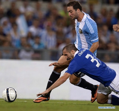 Argentina's Gonzalo Higuain fights for the ball with Giorgio Chiellini of Italy during their international friendly soccer match at the Olympic stadium in Rome, Aug. 14, 2013. Argentina won 2-1. (Xinhua/Alberto lingria)