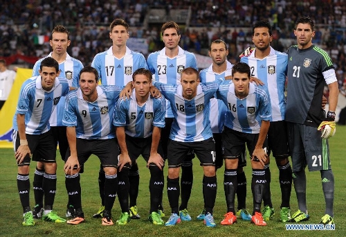 Argentina's players pose for pictures before their international friendly soccer match against Italy at the Olympic stadium in Rome, Aug. 14, 2013. Argentina won 2-1. (Xinhua/Alberto lingria)