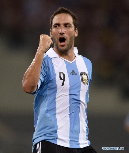 Argentina's Gonzalo Higuain gestures during an international friendly soccer match against Italy at the Olympic stadium in Rome, Aug. 14, 2013. Argentina won 2-1. (Xinhua/Alberto lingria)
