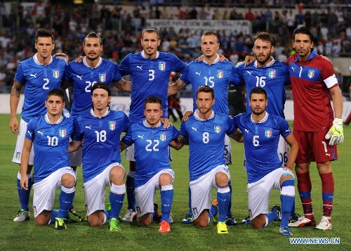 Italy's players pose for pictures before their international friendly soccer match against Argentina at the Olympic stadium in Rome, Aug. 14, 2013. Argentina won 2-1. (Xinhua/Alberto lingria)