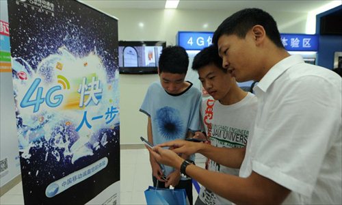 The file photo taken on July 3, 2013 shows a staff member (R) of China Mobile shows to customers how to surf the Internet using the 4G technology in Guiyang, capital of southwest China's Guizhou Province. The State Council has recently elevated national broadband development as a national strategy and announced an implementation timetable for its development over the coming eight years. Photo: Xinhua