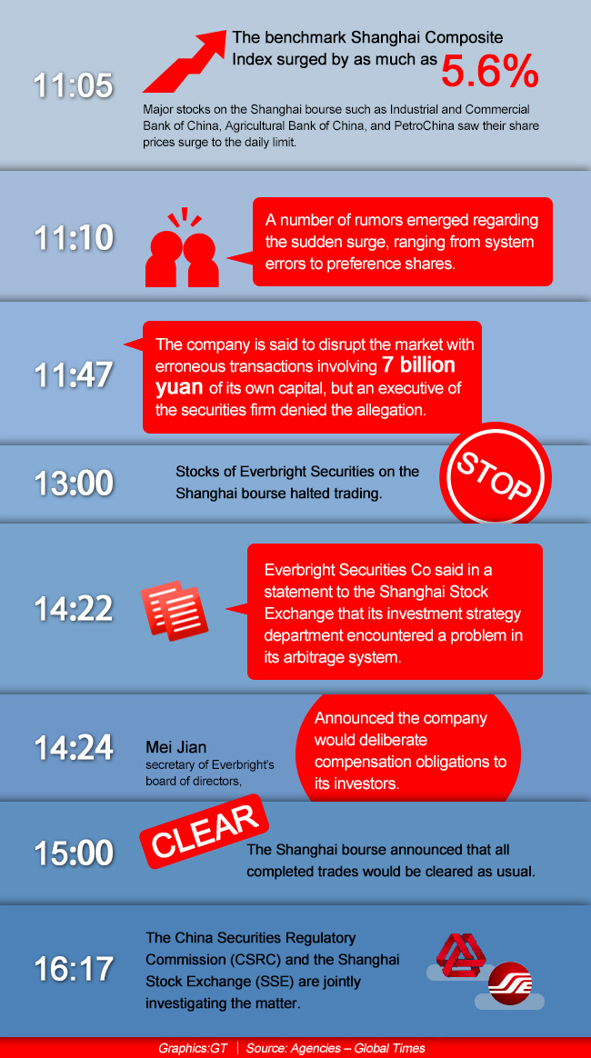 Shanghai-based Everbright Securities, China's fifth-largest brokerage by market value, mistakenly sent a large number of market orders to the Shanghai Stock Exchange because its proprietary trading system's "design flaws in fields such as program calls and credit control were triggered sequentially," according to a statement posted on the CSRC website.