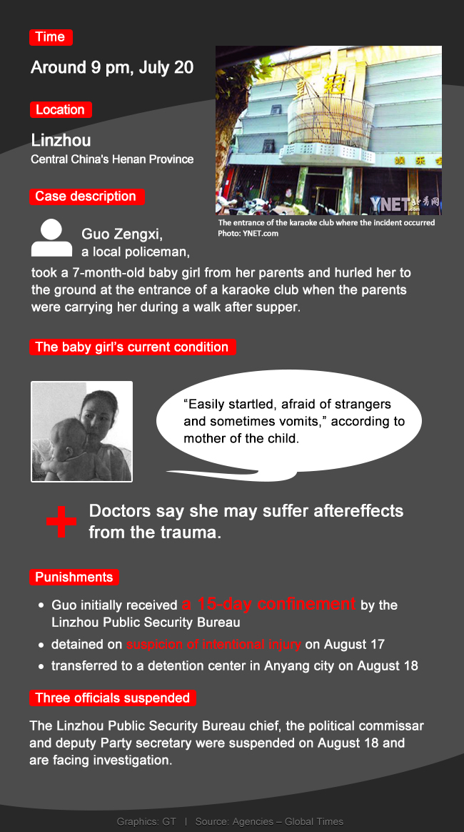 Three senior officials were suspended from their posts at Linzhou Public Security Bureau in Central China's Henan Province on August 19 after a policeman allegedly attacked a baby girl after drinking alcohol.
