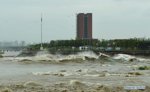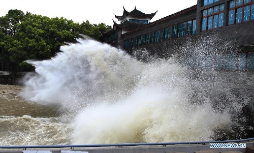 Surging waves pound the bank of Qiantang River in Hangzhou, capital of east China's Zhejiang Province, Aug. 22, 2013. The power of Typhoon Trami, was felt in the tidal bore of the Qiantang River, known as the world's largest tidal bore. (Xinhua/Long Wei)