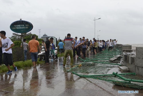 People get wet and fences are damaged after the surging waves of Qiantang River run across the levee in Haining City, east China's Zhejiang Province, Aug. 22, 2013. The power of Typhoon Trami, was felt in the tidal bore of the Qiantang River, known as the world's largest tidal bore. (Xinhua/Sun Fengli)