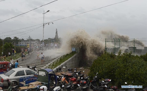 People run away as surging waves of Qiantang River run across the levee in Haining City, east China's Zhejiang Province, Aug. 22, 2013. The power of Typhoon Trami, was felt in the tidal bore of the Qiantang River, known as the world's largest tidal bore. (Xinhua/Sun Fengli)