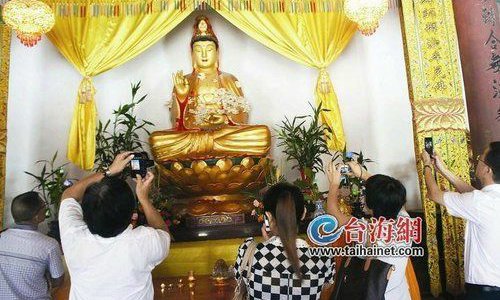 Visitors take photos of the Guanyin statue bearing clusters of mushrooms. Those at the Chetouan convent call the fungus "auspicious clouds" and take them as a good omen. Photo: taihainet.com/Lin Xiaoqi