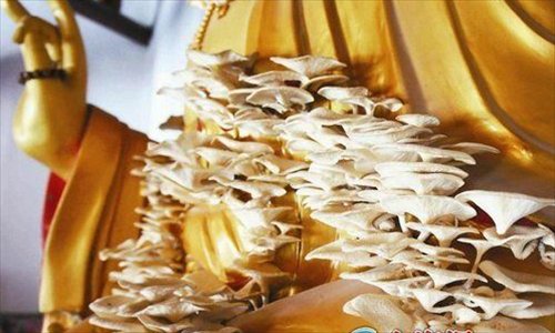 Clusters of mushrooms grow from the arms and chest of a statue of Guanyin (the Buddhist goddess of mercy) in Chetouan, a Buddhist convent in southern Fujian's Nanjing county. The 2.68-meter-high camphorwood statue sprouted mushrooms recently due to the high humidity and temperatures in the region. Photo: taihainet.com/Lin Xiaoqi