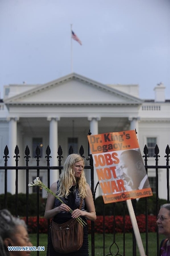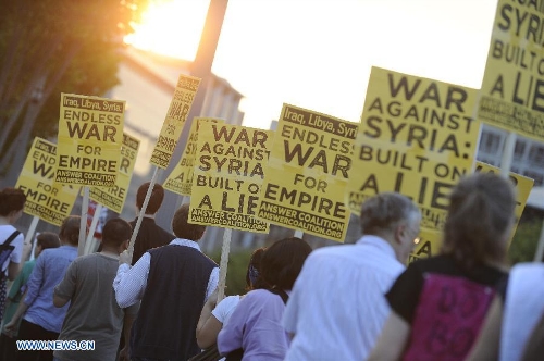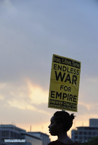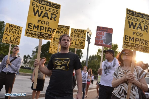 Activist hold placards during a demonstration against the military strike on Syria in front of the White House in Washington D.C., capital of the United States, Aug. 29, 2013. Amid signs the U.S. is ready to attack Syria, 140 members of the U.S. House of Representatives have signed onto a letter, demanding President Barack Obama get authorization of Congress before going ahead with the military strike. (Xinhua/Zhang Jun)