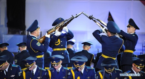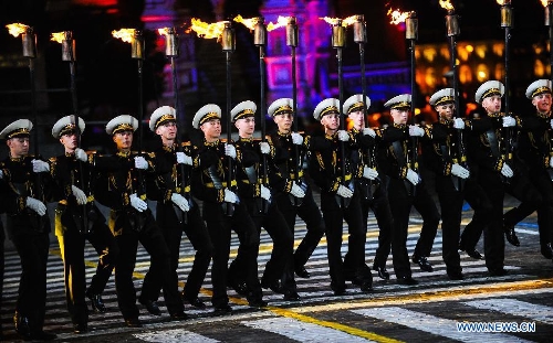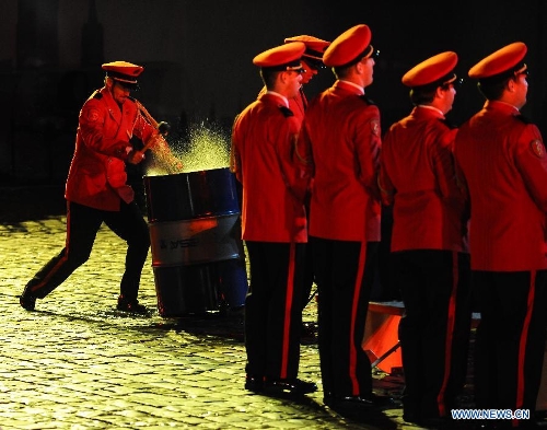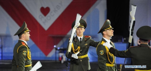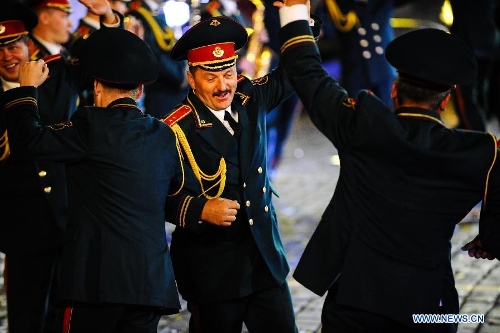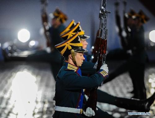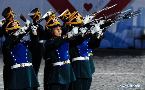 Russian honor guards perform during the International Military Music Festival "Spasskaya Tower" at Moscow's Red Square on Sept. 1, 2013. The units of the State Honor Guards and the leading Russian and foreign military bands participate in the festival runs from Sept. 1 to 8. (Xinhua/Dai Tianfang)