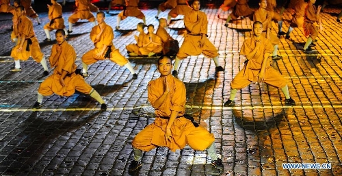 Members of the Chinese School of Shaolin Monastery perform during the International Military Music Festival "Spasskaya Tower" at Moscow's Red Square on Sept. 1, 2013. The units of the State Honor Guards and the leading Russian and foreign military bands participate in the festival runs from Sept. 1 to 8. (Xinhua/Dai Tianfang)