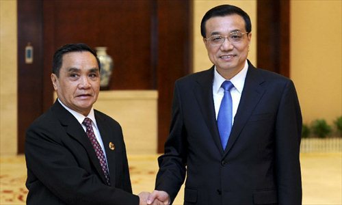 Chinese Premier Li Keqiang (R) meets with Lao Prime Minister Thongsing Thammavong, who is here to attend the 10th ASEAN-China Expo, in Nanning, capital of south China's Guangxi Zhuang Autonomous Region, Sept. 2, 2013. Photo: Xinhua