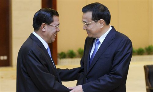 Chinese Premier Li Keqiang (R) meets with Cambodian Prime Minister Hun Sen, who is here to attend the 10th ASEAN-China Expo, in Nanning, capital of south China's Guangxi Zhuang Autonomous Region, Sept. 2, 2013. Photo: Xinhua