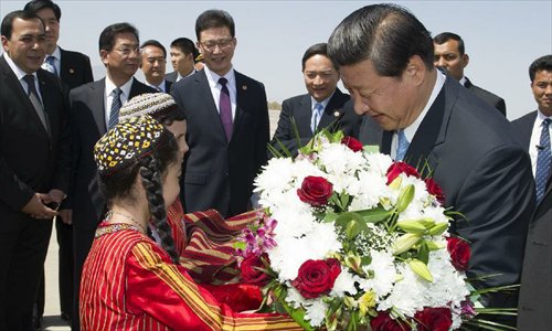 Chinese President Xi Jinping (R front) receives flowers upon his arrival in Ashkhabad for a state visit to Turkmenistan, September 3, 2013. Photo: Xinhua