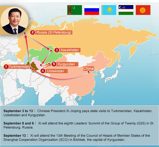 | More Videos: Xi to visit Turkmenistan, Kazakhstan, Uzbekistan, Kyrghyztan President Xi to attend G20 Summit & SCO meeting G20 Summit the highlight of the tour |