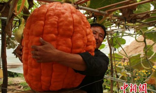 Farmer Sun Haijun embraces a genetically-modified pumpkin weighing in at 100-kilograms at the Feijian Agricultural Cooperative in Baoding, Hebei Province on September 9. Photo: chinanews.cn