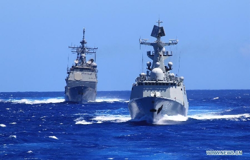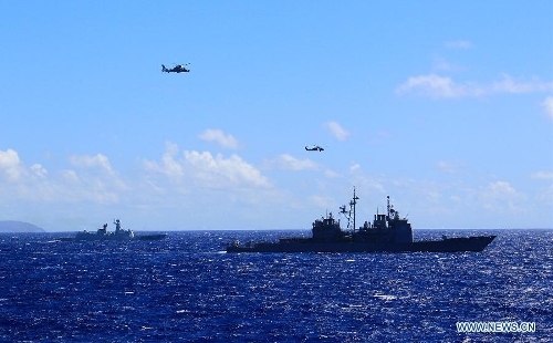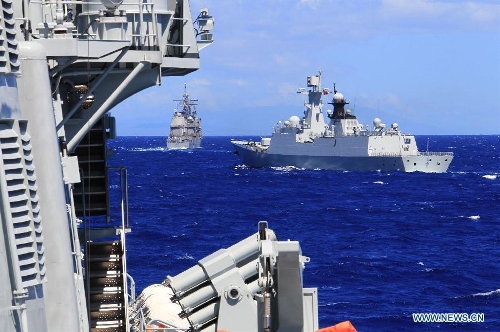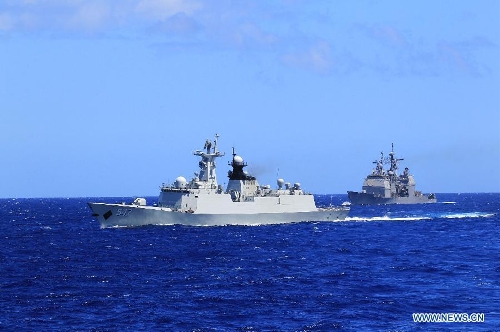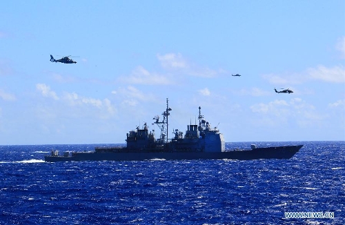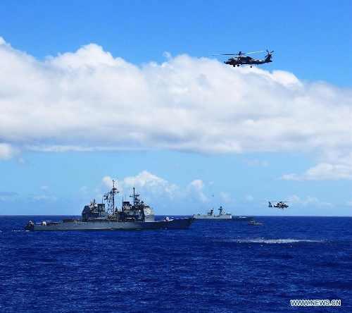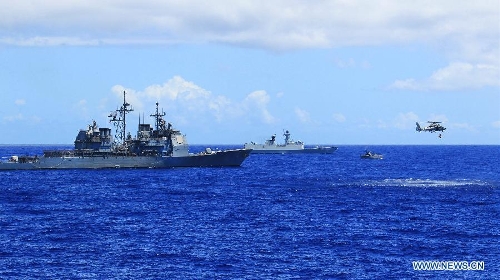 Chinese and US naval vessels participate in a search-and-rescue exercise near Hawaii, the United States, Sept. 9, 2013. Four naval ships, including Chinese navy's missile destroyer Qingdao, missile frigate Linyi and USS Lake Erie, and three helicopters, conducted a joint search-and-rescue exercise near Hawaii on Monday. (Xinhua/Zha Chunming)