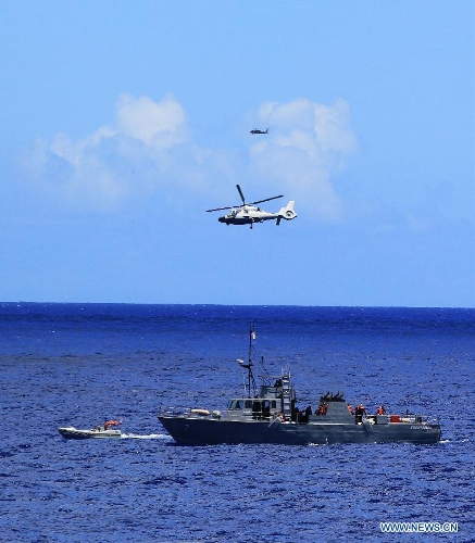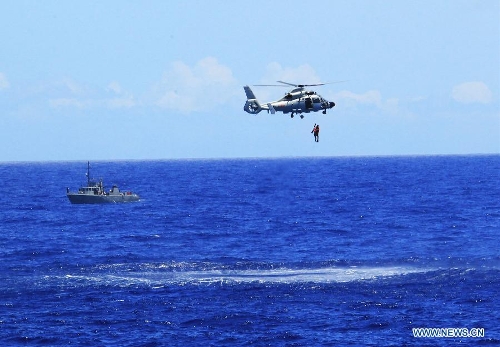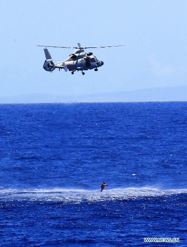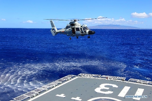 A helicopter aboard Chinese navy's missile destroyer Qingdao leaves for rescue mission during a joint search-and-rescue exercise near Hawaii, the United States, Sept. 9, 2013. Four naval ships, including Chinese navy's missile destroyer Qingdao, missile frigate Linyi and USS Lake Erie, and three helicopters, conducted a joint search-and-rescue exercise near Hawaii on Monday. (Xinhua/Zha Chunming)