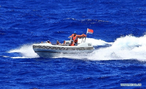 Chinese marines participate in a search-and-rescue exercise near Hawaii, the United States, Sept. 9, 2013. Four naval ships, including Chinese navy's missile destroyer Qingdao, missile frigate Linyi and USS Lake Erie, and three helicopters, conducted a joint search-and-rescue exercise near Hawaii on Monday. (Xinhua/Zha Chunming)