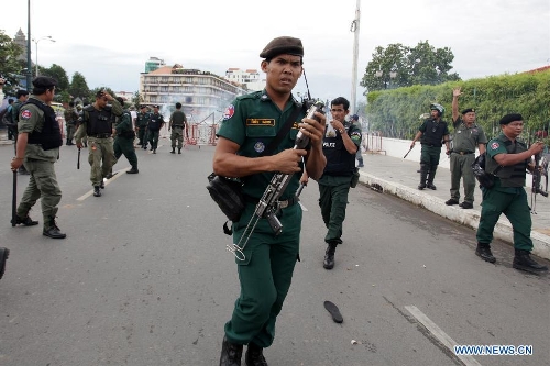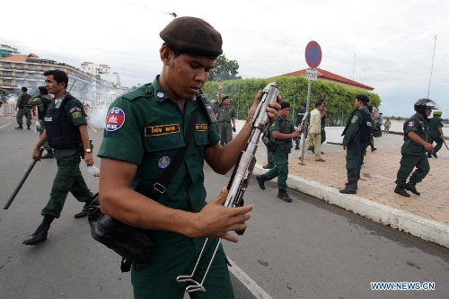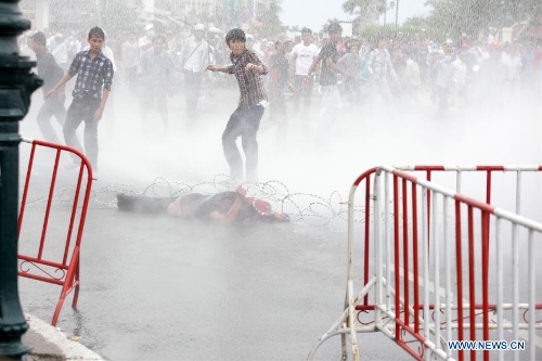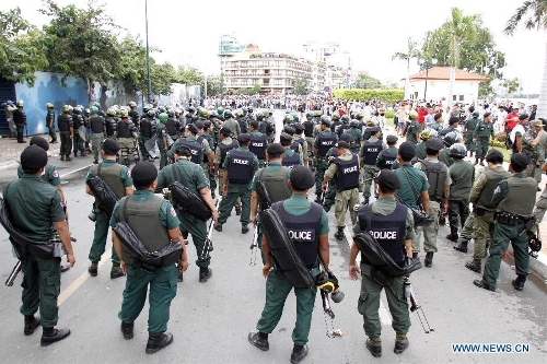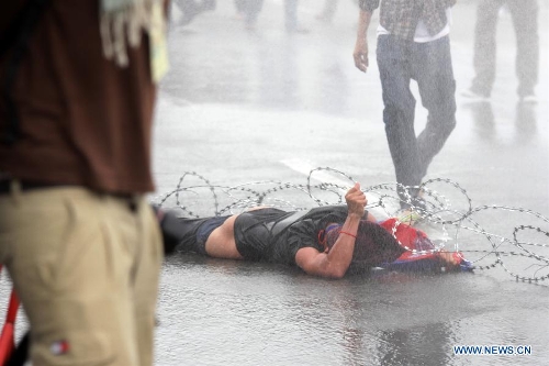 Protestors are dispersed by water cannon in Phnom Penh, Cambodia, Sept. 15, 2013. Cambodian police fired tear gas and water cannon to disperse hundreds of protesters near the Royal Palace on Sunday afternoon as they attempted to remove the police's barbed wire barricades in order to march through a street in front of the Royal Palace. (Xinhua/Phearum) Related:Cambodian police fires tear gas, water cannon to disperse opposition protestersPHNOM PENH, Sept. 15 (Xinhua) -- Cambodian police fired tear gas and water cannon to disperse hundreds of protesters near the Royal Palace on Sunday afternoon as they attempted to remove the police's barbed wire barricades in order to march through a street in front of the Royal Palace."We fired tear gas and water cannon to disperse them from the area," National Military Police spokesman Kheng Tito told Xinhua on Sunday. Full story