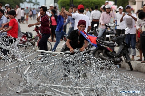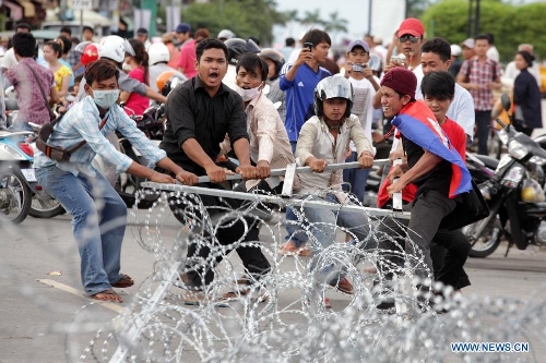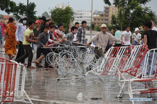 Protestors remove barbed wire barricades in Phnom Penh, Cambodia, Sept. 15, 2013. Cambodian police fired tear gas and water cannon to disperse hundreds of protesters near the Royal Palace on Sunday afternoon as they attempted to remove the police's barbed wire barricades in order to march through a street in front of the Royal Palace. (Xinhua/Phearum)