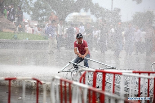 Protestors are dispersed by water cannon in Phnom Penh, Cambodia, Sept. 15, 2013. Cambodian police fired tear gas and water cannon to disperse hundreds of protesters near the Royal Palace on Sunday afternoon as they attempted to remove the police's barbed wire barricades in order to march through a street in front of the Royal Palace. (Xinhua/Phearum)
