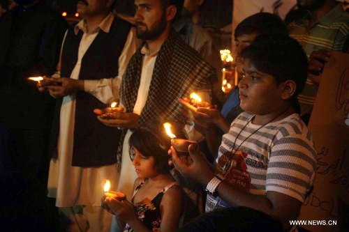 Pakistanis hold oil-lamps during a vigil ceremony for the victims of Peshawar church blasts, in southern Pakistani port city of Karachi on Sept. 22, 2013. At least 78 people were killed and over 146 others injured when a twin suicide bomb attack hit a Christian church in Pakistan's northwest Peshawar city on Sunday, officials said. (Xinhua/Masroor)