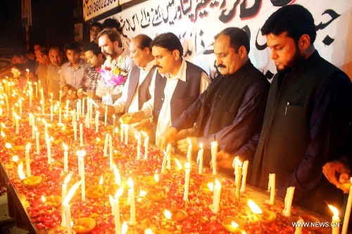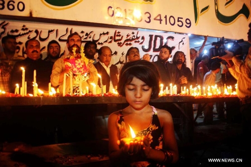 Pakistanis light candles during a vigil ceremony for the victims of Peshawar church blasts, in southern Pakistani port city of Karachi on Sept. 22, 2013. At least 78 people were killed and over 146 others injured when a twin suicide bomb attack hit a Christian church in Pakistan's northwest Peshawar city on Sunday, officials said. (Xinhua/Masroor)