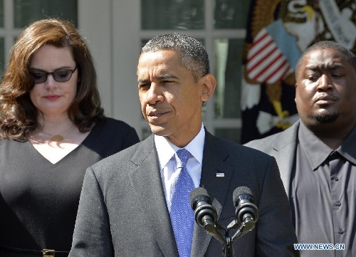 US President Barack Obama delivers a statement on the federal government shutdown in the Rose Garden of the White House in Washington D.C., capital of the United States, Oct. 1, 2013. US President Barack Obama on Tuesday blamed Republicans in Congress for the federal government shutdown, and defended his signature health care law. (Xinhua/Zhang Jun)