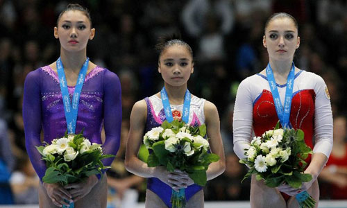 Gold medalist Huang Huidan (C) poses with silver medalist Kyla Ross (L) of the US and bronze medalist Aliya Mustafina of Russia during the awarding ceremony for the woman's uneven bar final of the world gymnastics championships in Antwerp, Belgium, October 5, 2013. Huang Huidan won the title with 15.400 points. Photo: Xinhua