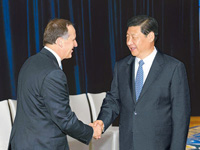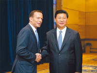 Chinese, Australian leaders pledge to boost ties ●Xi and Australian Prime Minister Tony Abbott agreed to push forward bilateral ties and speed up free trade negotiation. ●Australia is ready to speed up the FTA negotiations with China, and welcomes Chinese enterprises to invest in Australia, Abbott said. |