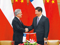 China, Chile pledge to further cooperation ●Xi and his Chilean counterpart, Sebastian Pinera, pledged to further bilateral cooperation between their countries. ●The two countries should put into full play the free trade agreement and expand two-way trade and investment, Xi said. |