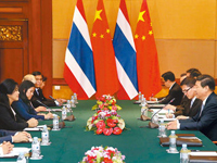 China, Thailand vow to advance bilateral ties ●Xi and Thai Prime Minister Yingluck Shinawatra pledged to further bilateral ties and China's relations with the ASEAN. ●Construction of high-speed railway and water conservancy infrastructure should be highlighted among the priorities of cooperation projects, Xi said. |