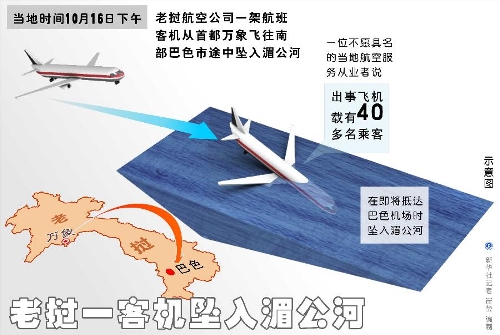 A Lao Airlines airplane crashed into the Mekong River at around 4 p.m. local time, and the casualty condition remains unknown, the airline confirmed to Xinhua. The plane was bound for Pakse, Champassak in Southern Laos from capital Vientiane.(Xinhua photo)
