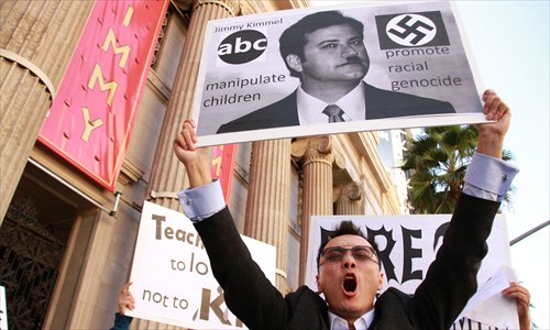 Protesters in Los Angeles carry signs protesting the ABC night show host Jimmy Kimmel on Wednesday. A child made divisive comment in his program earlier this month about how the US should "kill everyone in China" to deal with American debt. Kimmel apologized in front of the protesting group Wednesday. Photo: Yu Yan