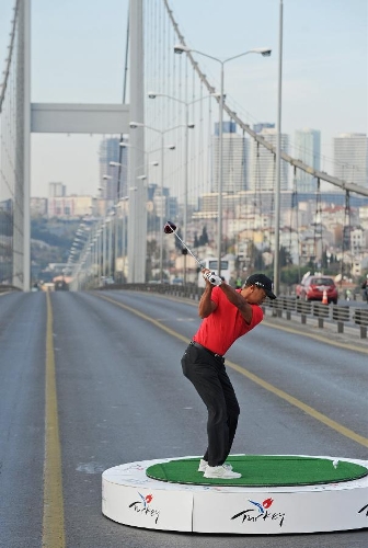 US golfer Tiger Woods hits a ball as he poses during an event to promote the upcoming Turkish Airlines Open 2013 golf tournament, on the Bosphorus Bridge that links the city's European and Asian sides in Istanbul on Nov. 5, 2013. The game will start on Thursday at the Mediterranean city Antalya of Turkey. (Xinhua/Lu Zhe)