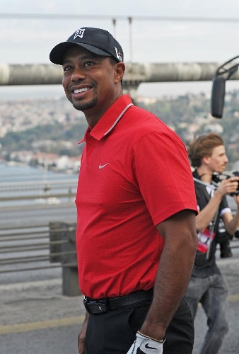 US golfer Tiger Woods poses during an event to promote the upcoming Turkish Airlines Open 2013 golf tournament, on the Bosphorus Bridge that links the city's European and Asian sides in Istanbul on Nov. 5, 2013. The game will start on Thursday at the Mediterranean city Antalya of Turkey. (Xinhua/Lu Zhe)