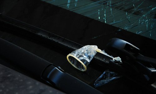 A condom filled with unknown liquid lies on a car's windscreen wiper after smashing its windshield on November 5. The car was parked near the Tianhe Clinic in Jiande, East China's Zhejiang Province. Photo: CFP/news.163.com