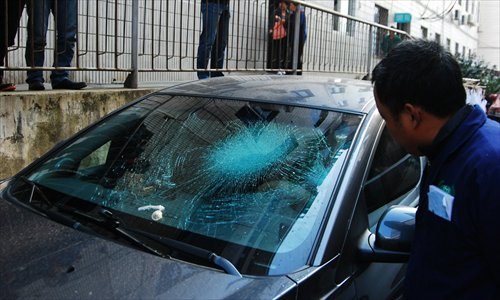 A man inspects a car windshield smashed by a condom filled with unknown liquid. The condom was dropped from atop a high-rise building on November 5 in Jiande, East China's Zhejiang Province. The car's owner, surnamed Ye, reported the incident to police after making the discovery. Photo: CFP/news.163.com